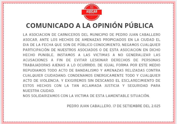 La Asociación de Carniceros (ASOCAR) de Pedro Juan Caballero ha emitido un comunicado oficial para repudiar las amenazas que recibió el carnicero Elías Ocampos, quien fue intimidado en su local, la Distribuidora de Carnes Amambay, donde le dejaron un panfleto con amenazas y dos balas de fusil, en un aparente conflicto por los precios de la carne en la ciudad.