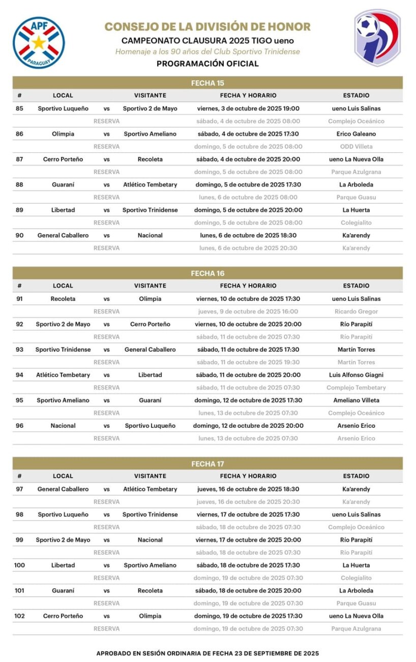 El Consejo de la División de Honor del fútbol paraguayo programó las próximas tres fechas del torneo Clausura, llegando así hasta la jornada 17 del superclásico.