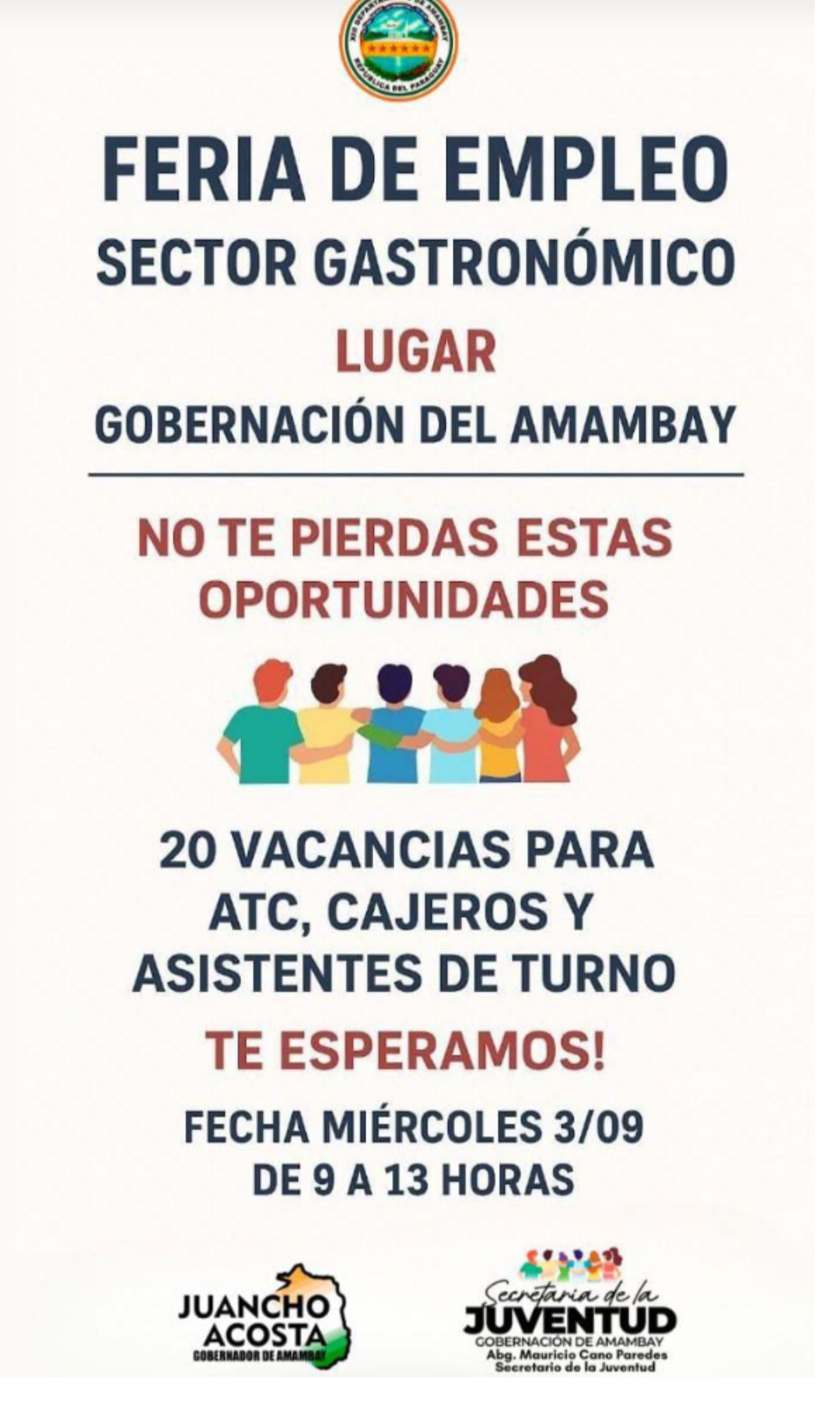 La Gobernación de Amambay, a través de la Secretaría de la Juventud, está organizando una feria de empleo para el sector gastronómico que ofrecerá 20 vacantes. El evento se llevará a cabo el próximo miércoles 3 de septiembre en la sede de la Gobernación, en un horario de 09:00 a 13:00 horas.