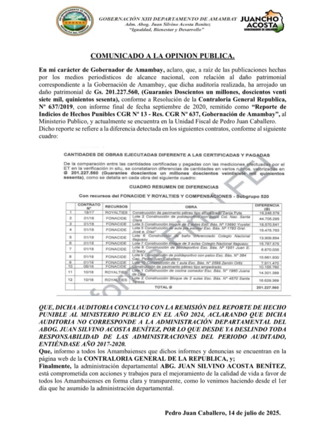 En un comunicado escrito y posteriormente en un material audiovisual difundido en redes sociales, el gobernador Acosta explicó que la auditoría fue realizada conforme a la Resolución N° 637/2019 de la Contraloría General de la República, con un informe final de septiembre de 2020. Este informe, denominado “Reporte de Indicios de Hechos Punibles CGR N° 13 – Res. CGR Nº 637, Gobernación de Amambay”, fue remitido al Ministerio Público y actualmente se encuentra en la Unidad Fiscal de Pedro Juan Caballero.