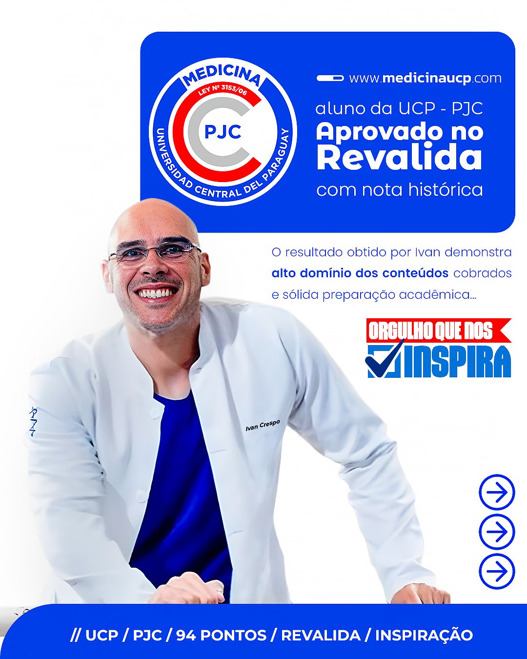 El estudiante Iván Crespo, de la Universidad Central del Paraguay (UCP), logró un resultado sobresaliente al aprobar la primera fase del Examen Nacional de Revalidación del Título de Médico (Revalida) con 94 puntos. Este resultado posiblemente sea el más alto del país.