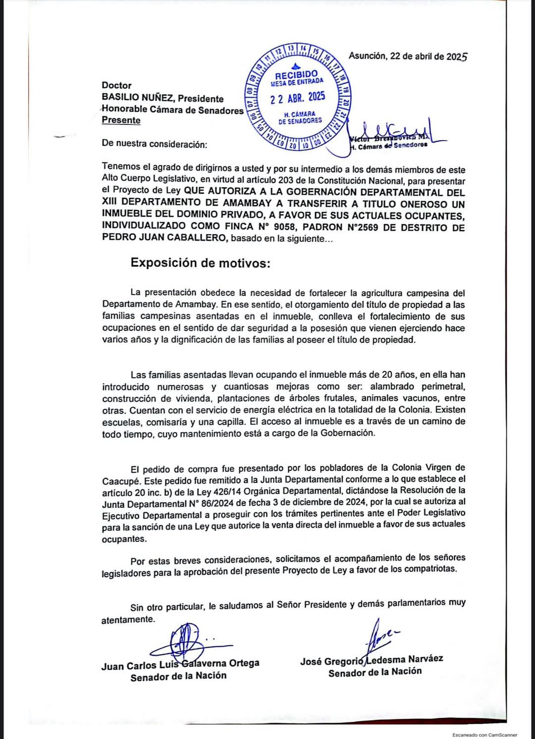 Este martes (22), los senadores Juan Carlos “Nano” Galaverna y José “Pakova” Ledesma, presentaron un proyecto de ley que consisten en desafectar tierras en la colonia Virgen de Caacupé de Pedro Juan Caballero, para que pobladores de dicha localidad accedan a sus respectivos títulos de propiedad.
