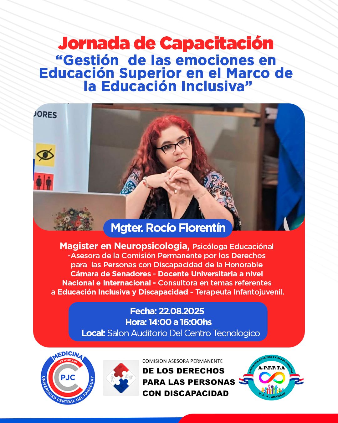 La jornada contará con la disertación de la Mgter. Rocío Florentín, especialista en neuropsicología y reconocida consultora en educación inclusiva, quien también es asesora de la Comisión Permanente por los Derechos de las Personas con Discapacidad de la Honorable Cámara de Senadores. Florentín abordará la importancia de la gestión emocional y la salud mental como ejes fundamentales en la formación universitaria inclusiva.